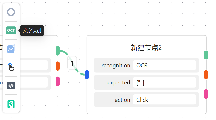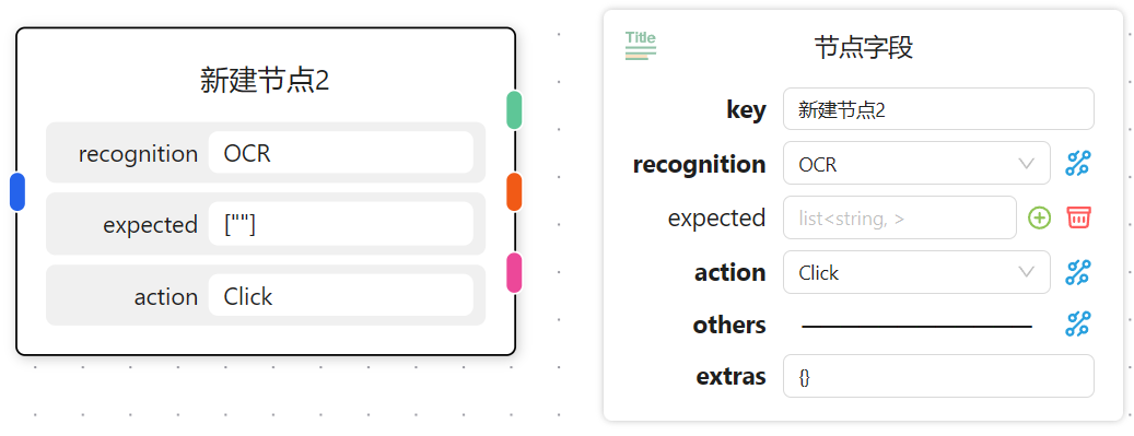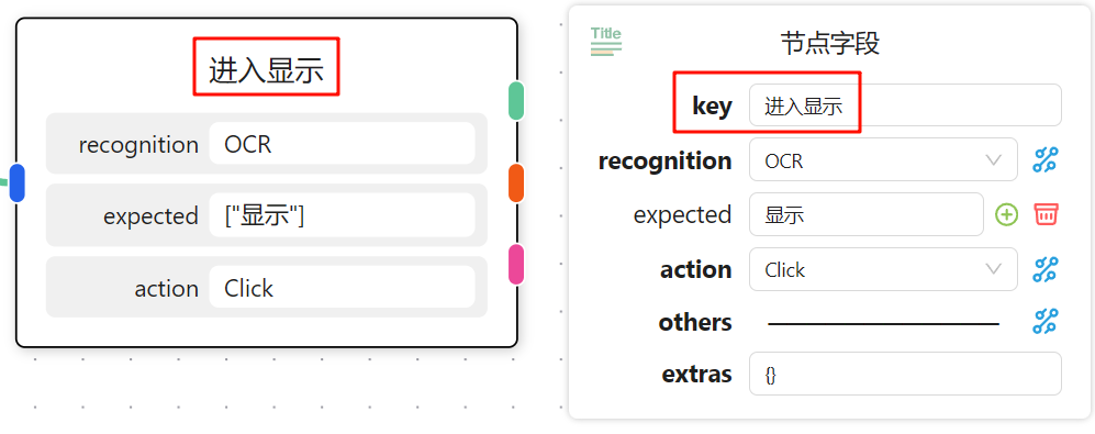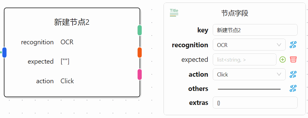由于我们直接生成了一个 OCR 模板节点,相关字段已经被自动配置,在此节点上,我们仅需在 expected 字段中填写需要识别的文本即可,相关字段会同步显示在节点上。(此处 GIF 动图会丢失部分颜色,实际在编辑时会正常渲染字段灰底)