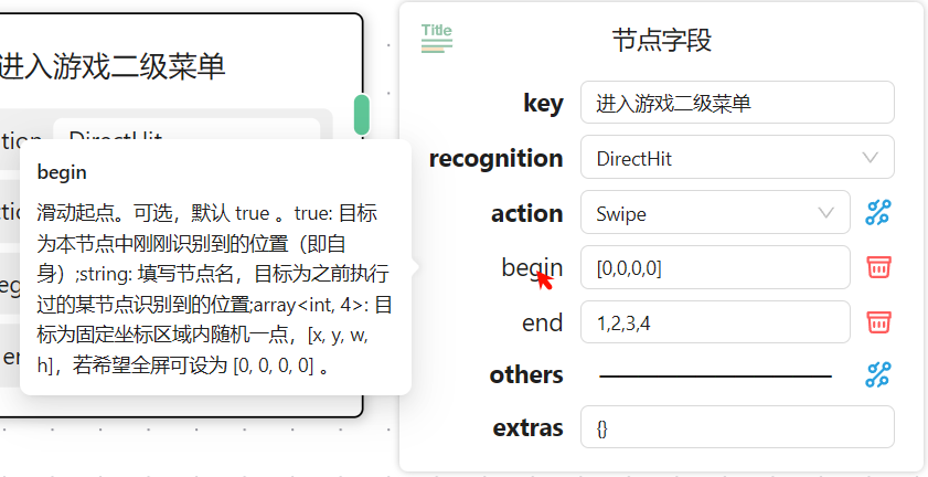 在实例中,进入游戏二级菜单 需要我们进行 Swipe 滑动操作,此动作一般需要配置 beginend 两个值。