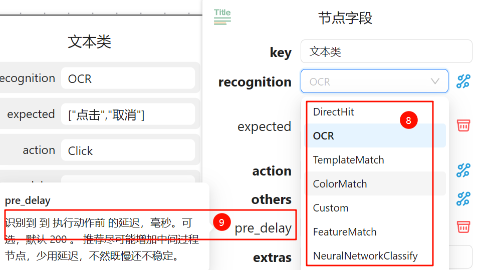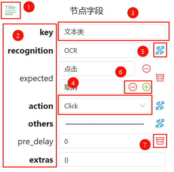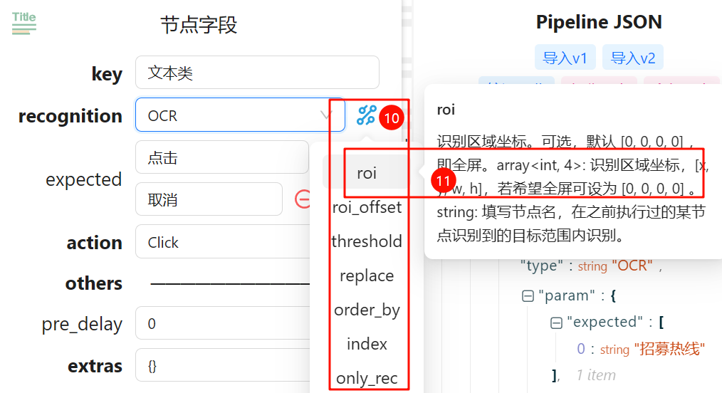 复制标题:将编译后的标题复制到粘贴板,方便导入 maadebugger 等开发工具。字段排序:打开字段排序模态框,自定义二级字段的显示顺序。编辑 JSON:打开节点 JSON 编辑器,提供 IDE 级的编辑体验。字段键:键不可编辑(由 Pipeline 协议决定),加粗字体为一级字段;右侧为对应字段的值。自由字段值:此类字段的值可以被编辑,编译规则请参考 编译器选项字段值:此类字段的值为固定的选项,已被预制好,可以直接通过下拉框选择,详见 [10]。二级字段列表:选择选项后会添加指定二级字段的键值对,详见 [12-13]。列表操作:若字段值为列表类型,可通过增减按键添加或删除列表的某个值。删除字段:删除此字段。